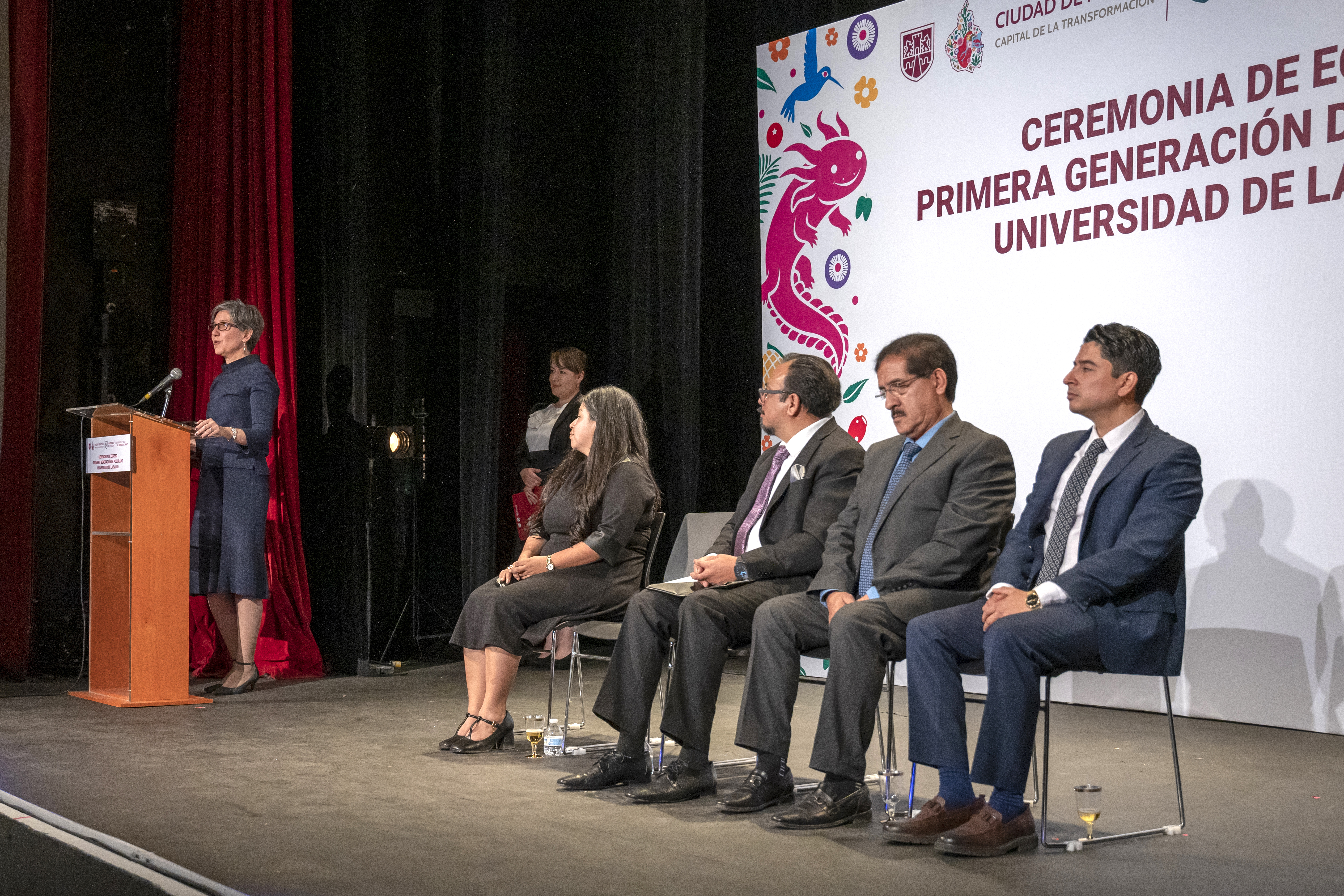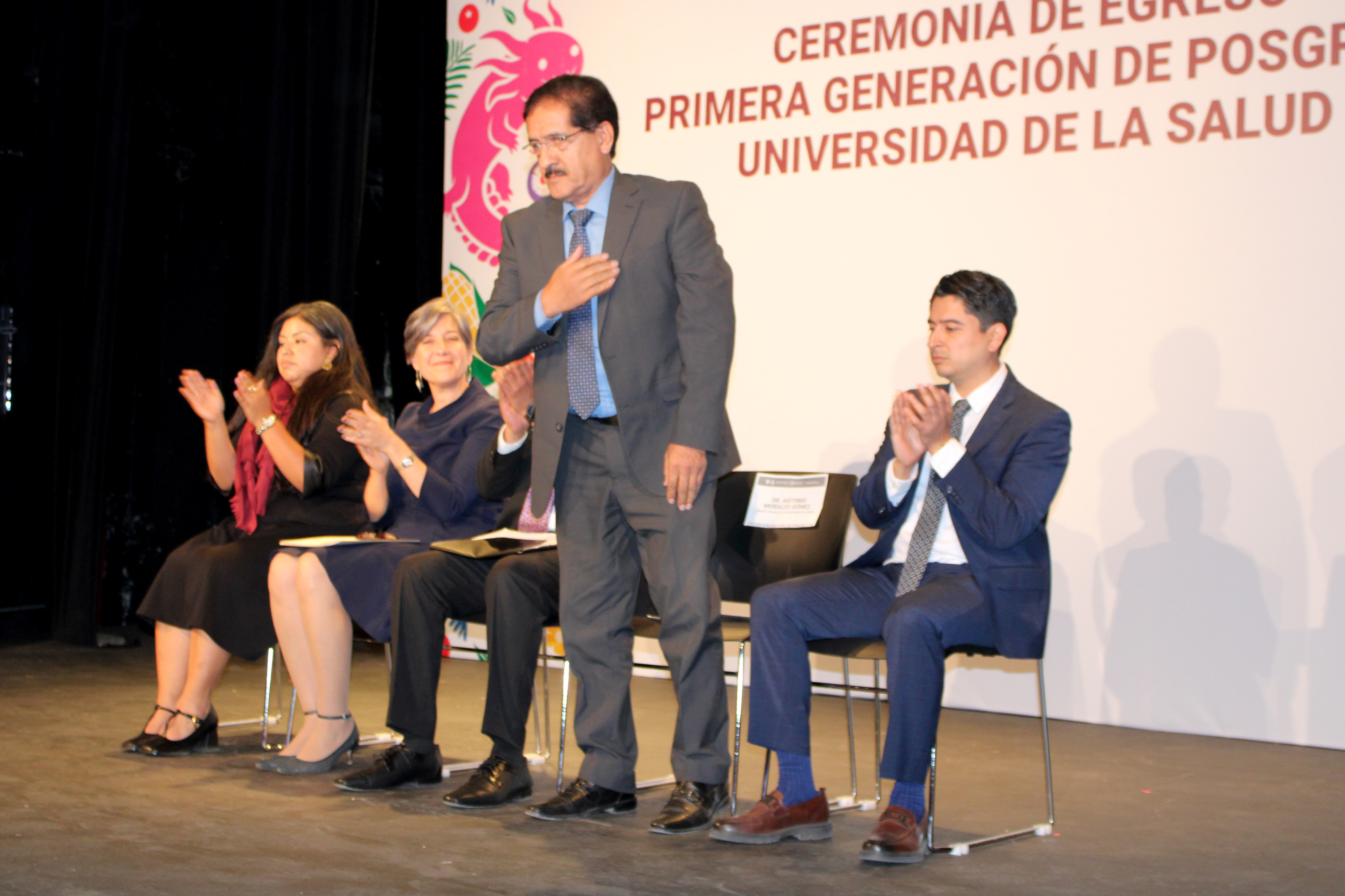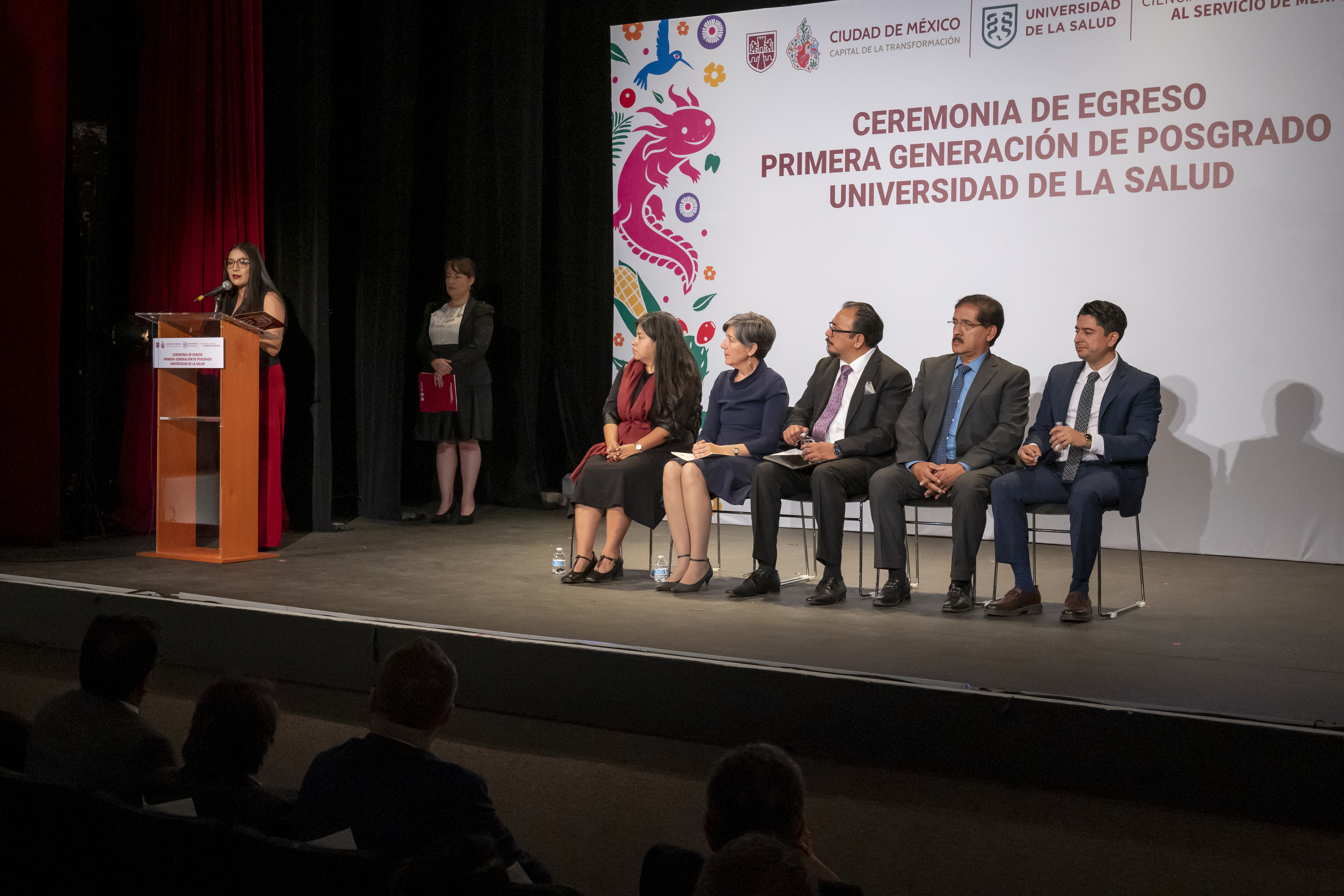 El acto contó con la presencia de autoridades académicas y del sector salud. El presídium lo integraron el director general de la UNISA, Antonio Morales Gómez; la directora de Proyectos de Investigación y Desarrollo Académico de la UNISA, Alejandra García Arista; el subdirector de Posgrado de la UNISA, Hugo Eduardo Delgado Becerra; la comisionada de Fomento Sanitario, Giota Panopoulou, en representación de la titular de COFEPRIS, Armida Zúñiga Estrada; y el ingeniero Luis Miguel Alvarado del Prado, en representación del titular de la Secretaría de Educación, Ciencia, Tecnología e Innovación de la Ciudad de México, Pedro Moctezuma Barragán.