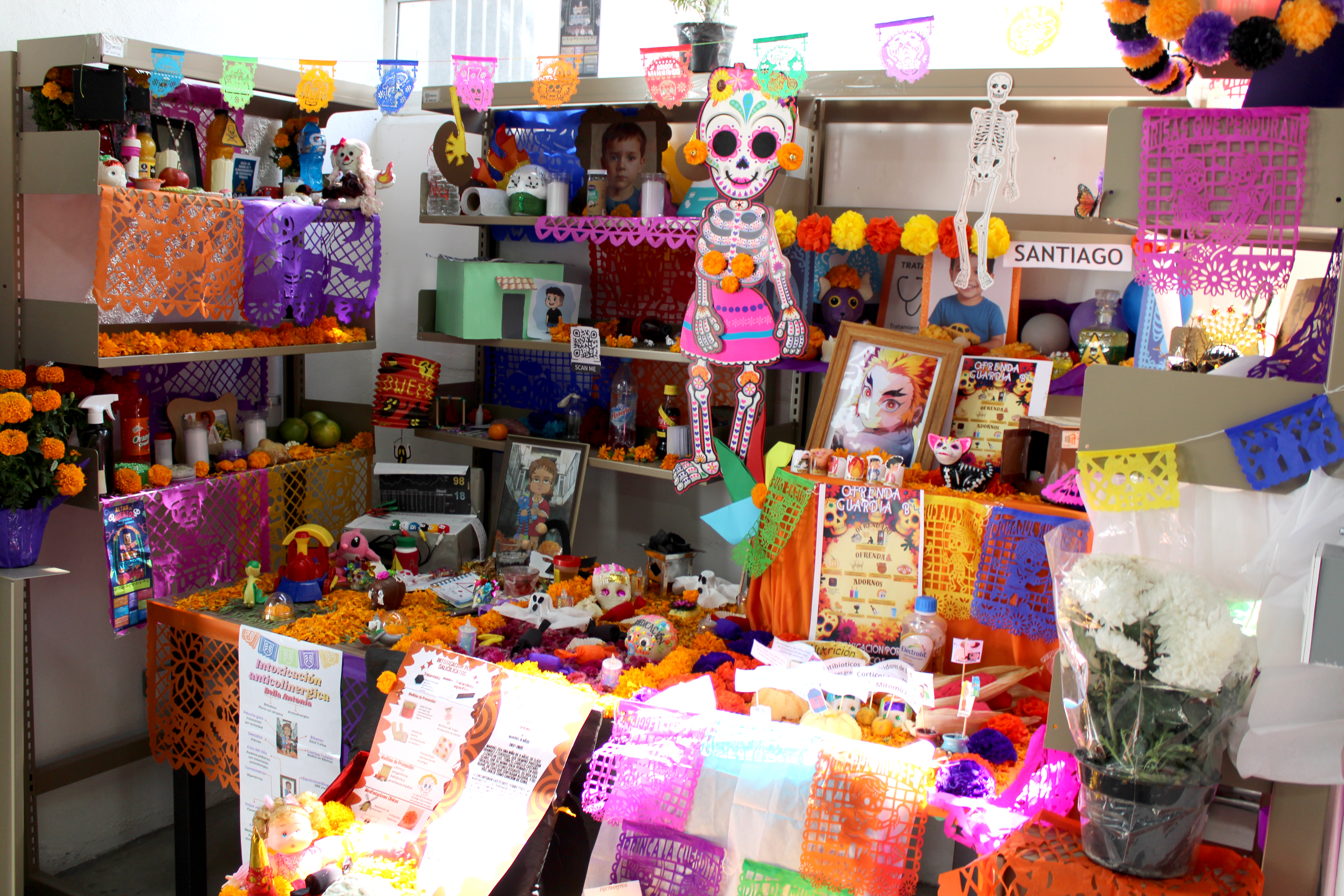 Como parte de las actividades conmemorativas del Día de Muertos, el doctor Rafael Eduardo González Reyes, docente del área de Atención Primaria a la Salud en la Comunidad Vulnerable (APSCV), en colaboración con los grupos 2401 y 2403 de la licenciatura en Medicina General y Comunitaria, presentó la “Ofrenda en honor a los infantes accidentados”. Esta intervención académico-lúdica, desarrollada en el marco del módulo Atención integral del niño y adolescente II, tiene como propósito representar, a través de una ofrenda tradicional mexicana, los factores de riesgo, manifestaciones clínicas, tratamientos y medidas de prevención y promoción de la salud en casos de intoxicación y quemaduras pediátricas por Salicilatos, Anticolinérgicos, Organofosforados, Hidrocarburos y Cáusticos. La ofrenda se compone de tres elementos clave: el ofrendado, que simboliza a un infante ficticio con características sociodemográficas vinculadas al tipo de intoxicación; la ofrenda, que incorpora elementos tradicionales para representar el tratamiento y las acciones preventivas; y los adornos, que expresan de forma abstracta las manifestaciones clínicas y paraclínicas asociadas. Esta propuesta busca sensibilizar a la comunidad universitaria sobre los riesgos y cuidados en la salud infantil, integrando saberes médicos con expresiones culturales profundamente significativas.